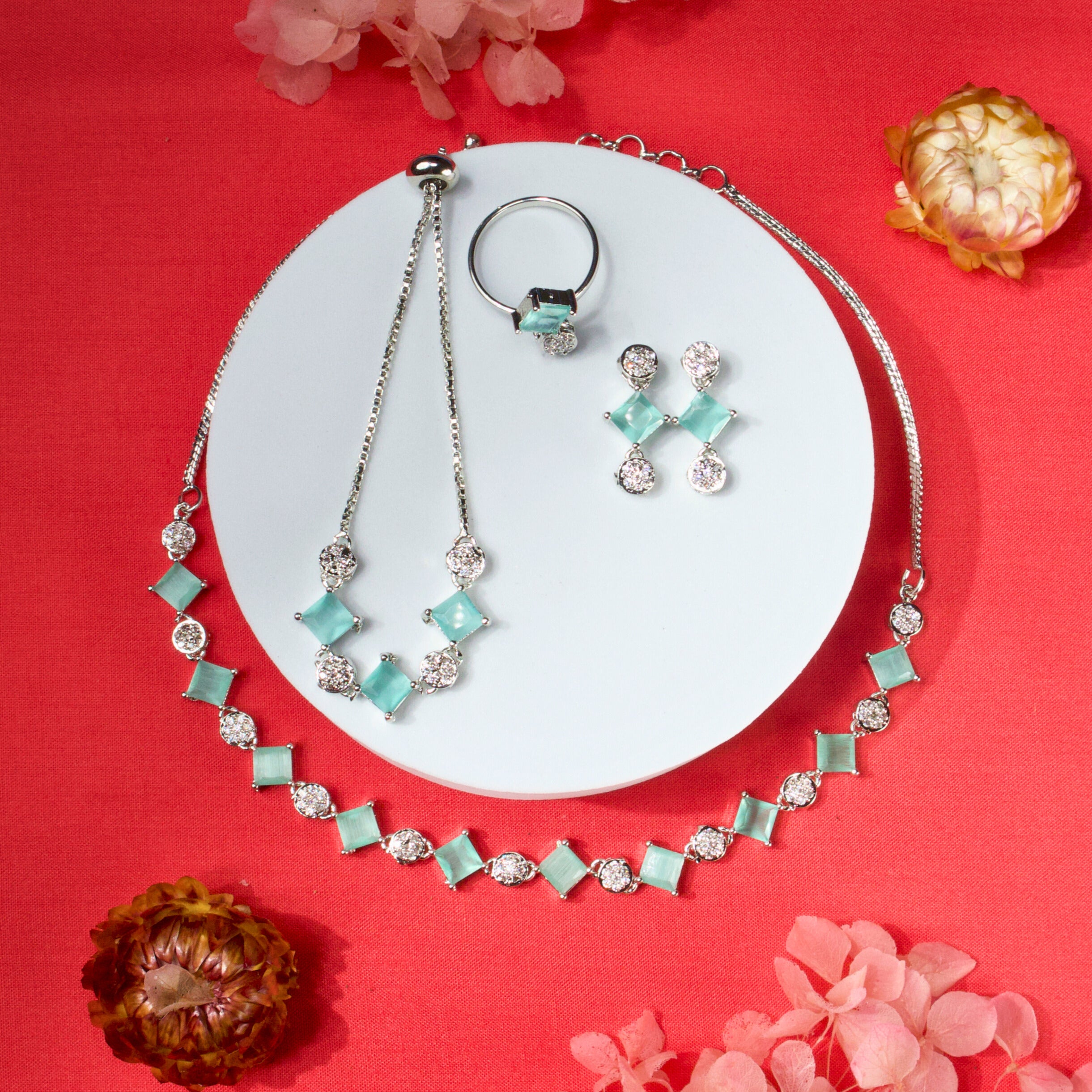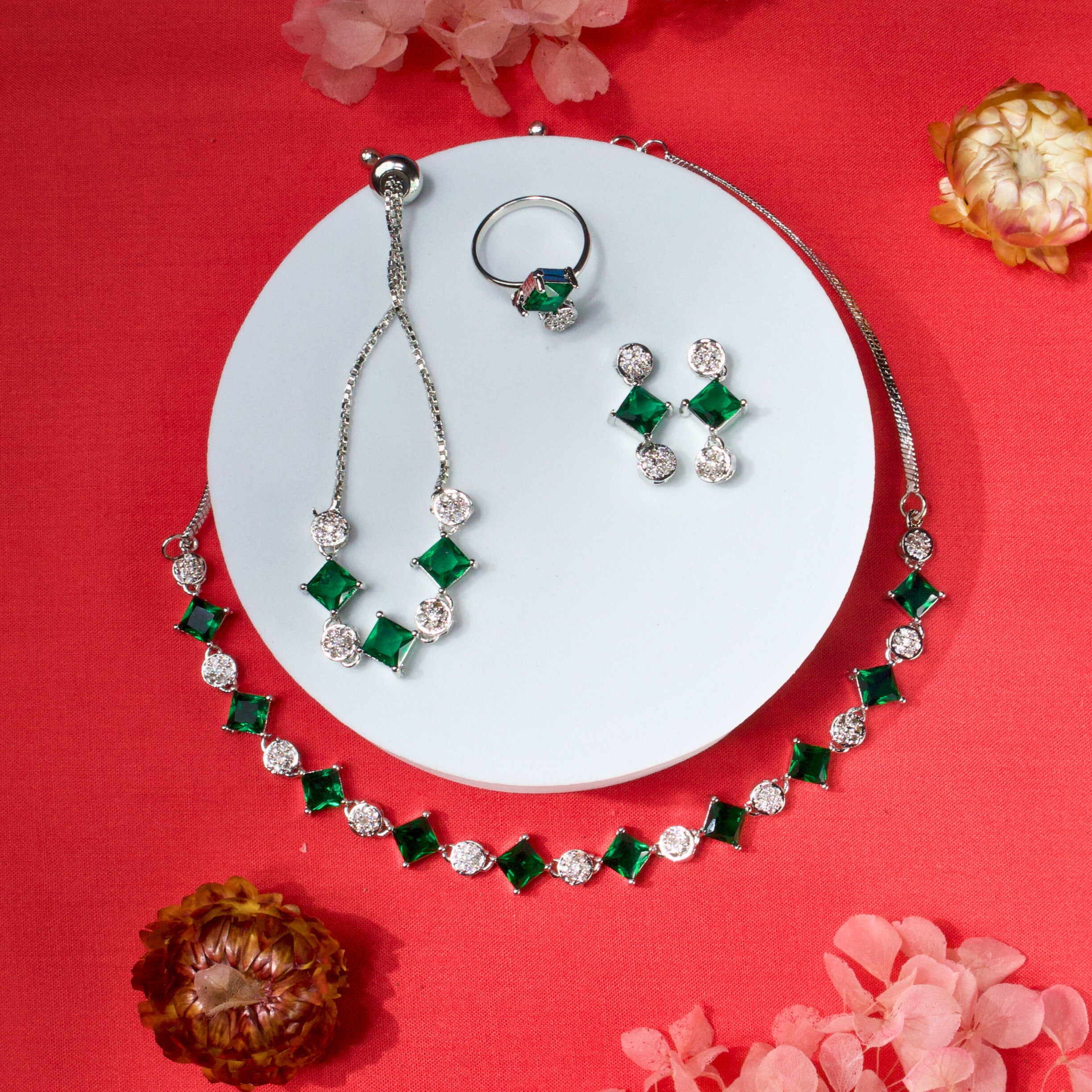 Add a refreshing touch of modern elegance to your wardrobe with this Geometric Sparkle Collection. This coordinated set features a Single Line Necklace Combo with multifaceted, square-cut stones that offer a sophisticated and clean aesthetic. It is the perfect choice for those who appreciate sharp lines and subtle, refined elegance.