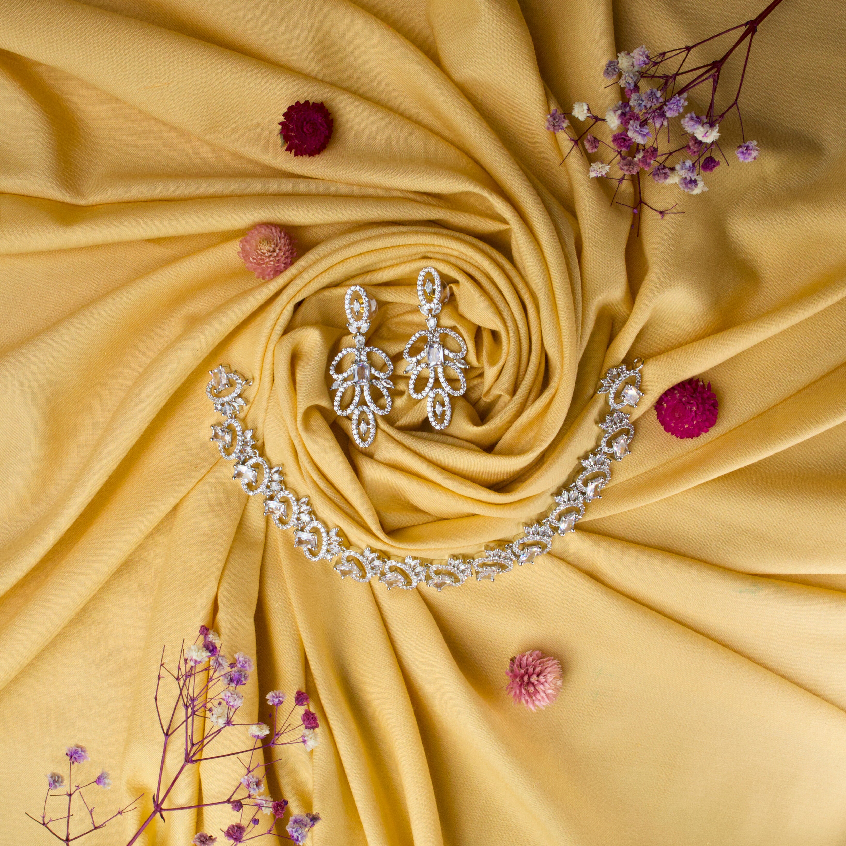 Make a grand entrance with this stunning statement set. Featuring a Crown Necklace With Leaf Earrings and an intricate lace-like crystal design, this set is designed for the woman who loves high-glamour and regal elegance.
