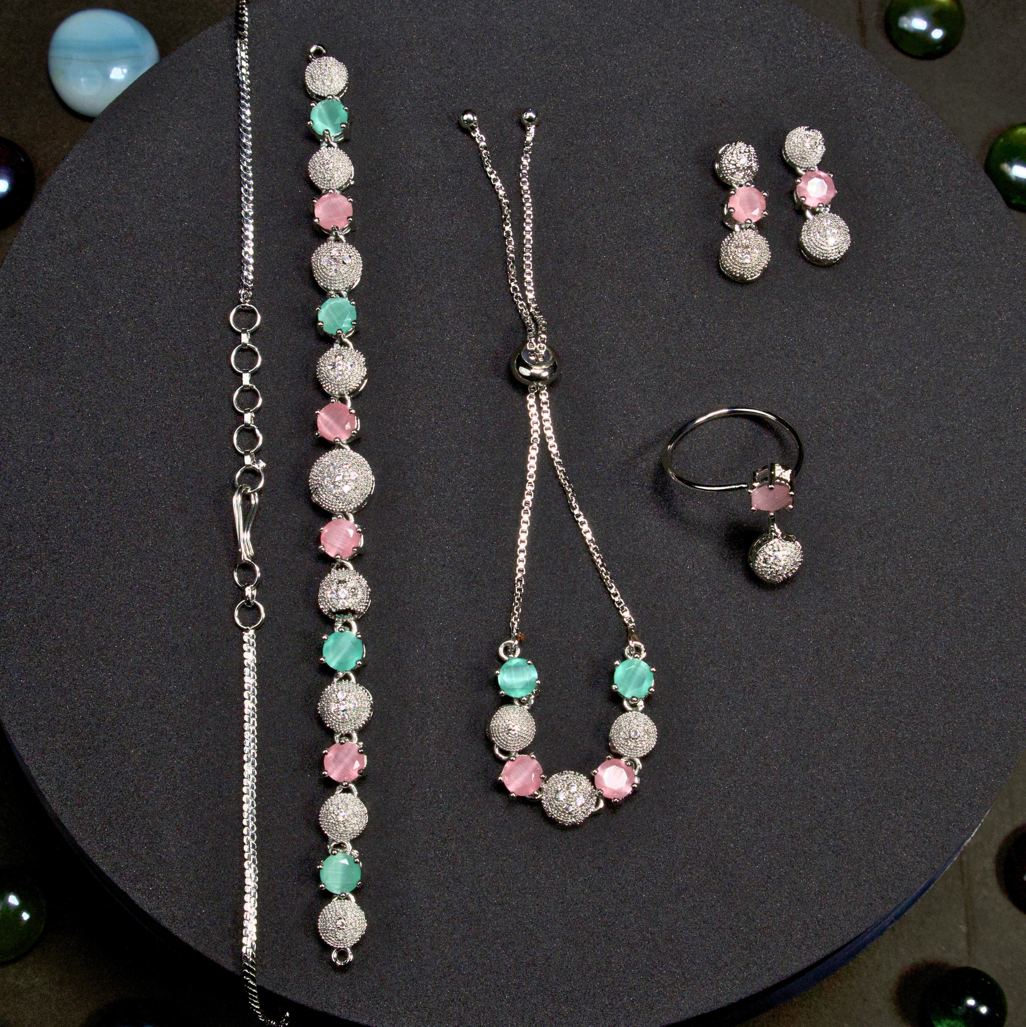 - Components: 1 Necklace, 1 Pair Earrings, 1 Ring, 1 Bracelet