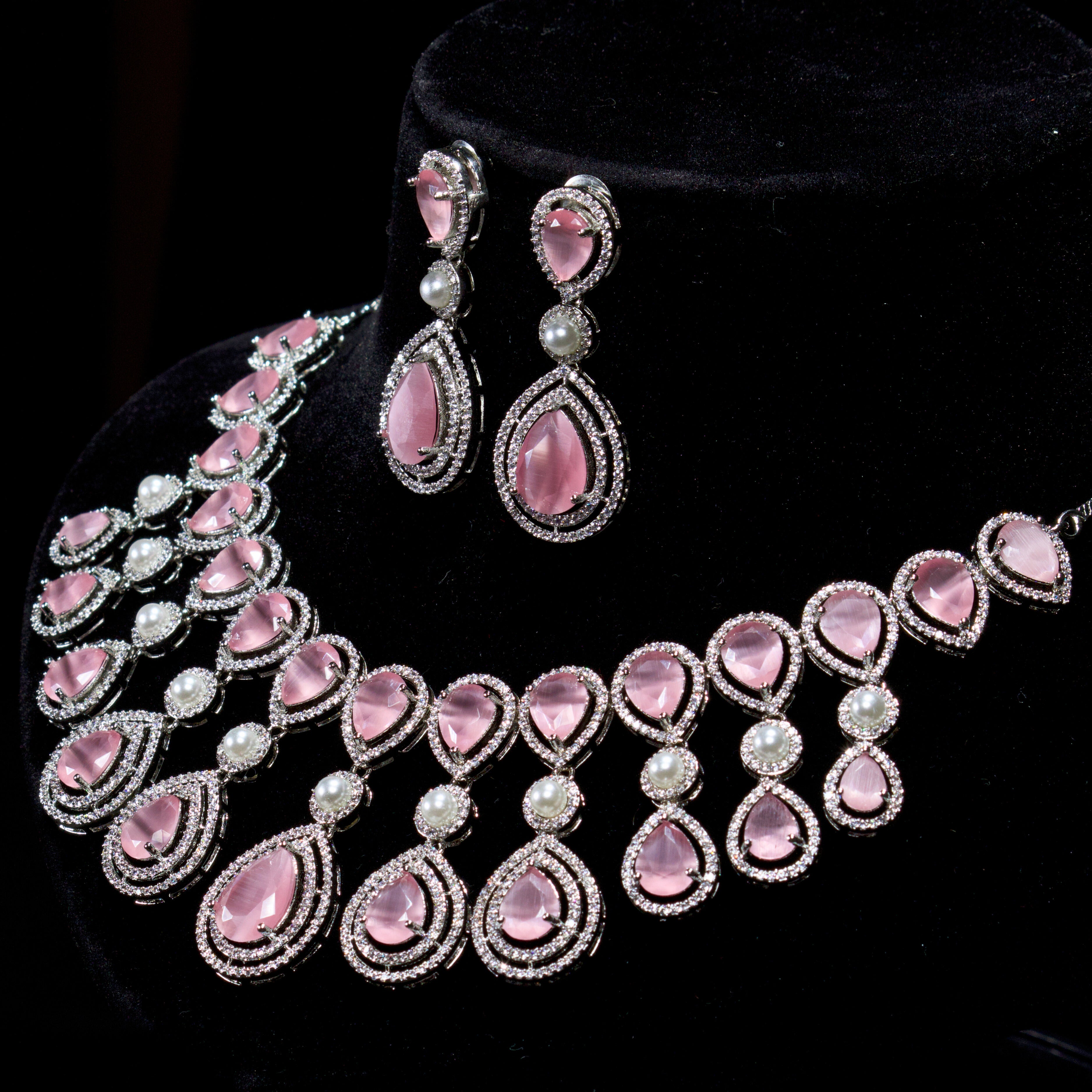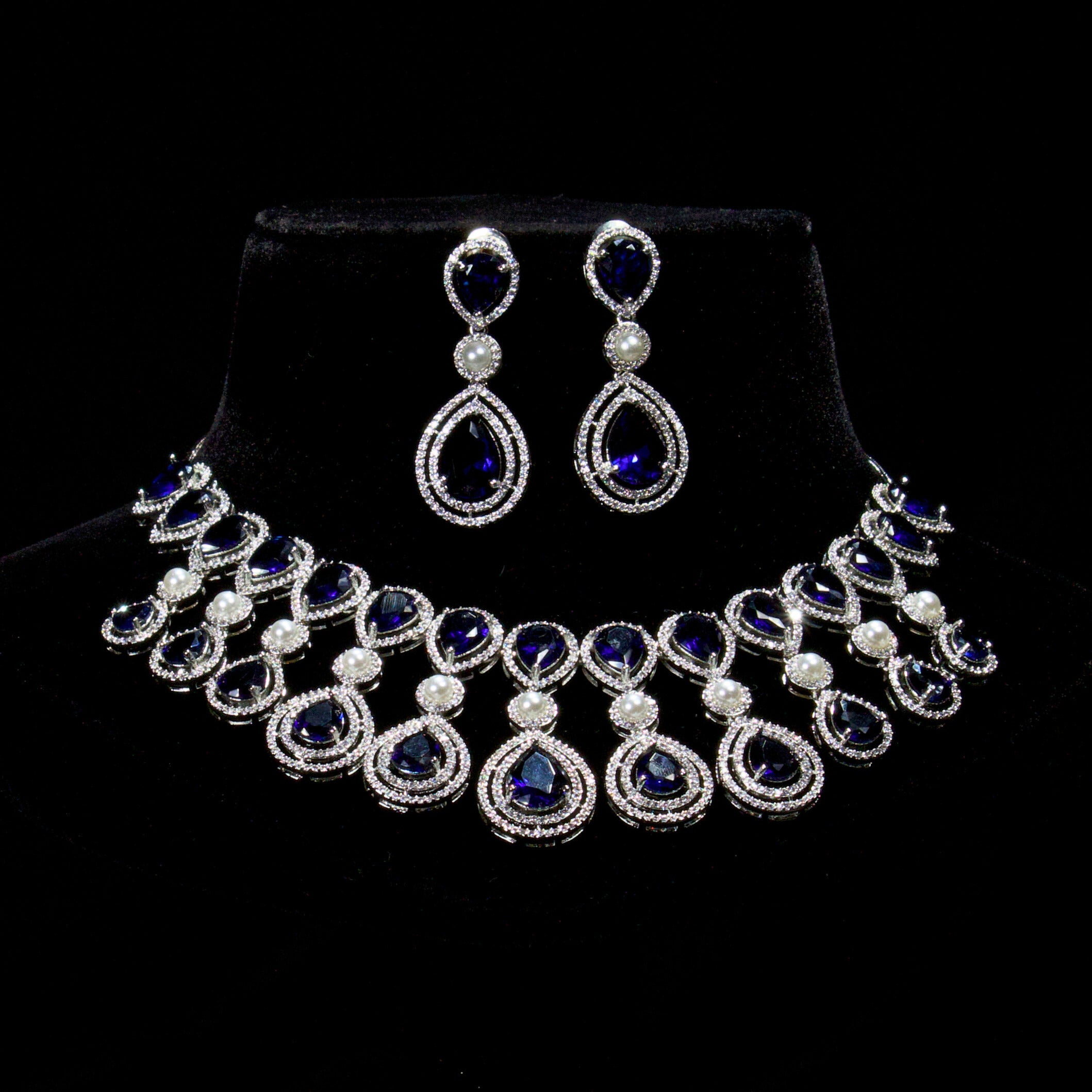 Command attention with this regal Teardrop Necklace With Earrings. Designed for high-glamour events, this necklace features a dramatic cascading fringe of brilliant teardrop stones accented with lustrous pearls. It is the ultimate statement piece for weddings, grand receptions, or formal gala events.